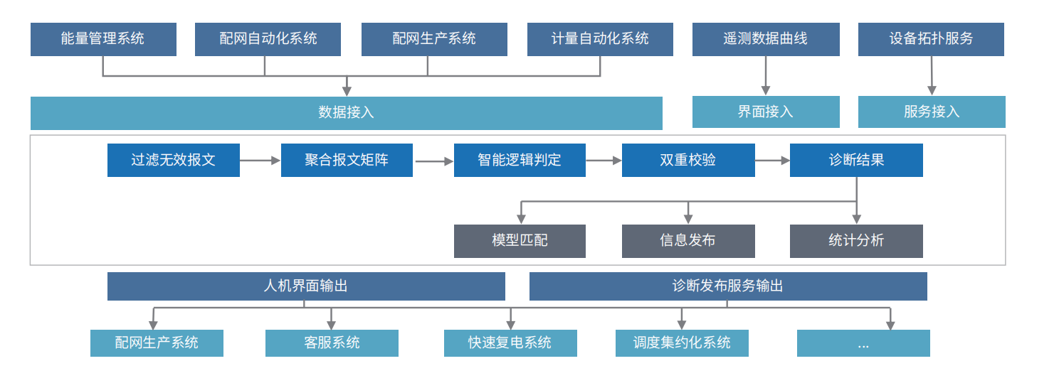 利用智能感知、數(shù)據(jù)挖掘等技術(shù),通過調(diào)度遙測、遙信及電網(wǎng)拓?fù)湫畔?基于專家經(jīng)驗的故障智能診斷技術(shù)實現(xiàn)故障域區(qū)域的判定,然后利用多源數(shù)據(jù)基于大數(shù)據(jù)分析實現(xiàn)故障定位輔助,結(jié)合設(shè)備健康狀態(tài)信息、低壓智能電表數(shù)據(jù)、光貓帶電信息及話務(wù)停電報障等多種信息綜合判斷停電位置和范圍,并對故障點(diǎn)進(jìn)行綜合信息分析推理和判定,實現(xiàn)配網(wǎng)線路的故障精確位置判定,最終基于快速復(fù)電流程實 現(xiàn)故障的發(fā)布及聯(lián)動。