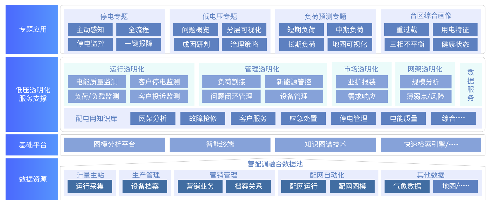 上承國家《關(guān)于新形勢(shì)下配電網(wǎng)高質(zhì)量發(fā)展的指導(dǎo)意見》提出的建設(shè)任務(wù)要求,下接低壓配電網(wǎng)建設(shè)發(fā) 展實(shí)際工作需要,從實(shí)際業(yè)務(wù)出發(fā)規(guī)劃低壓配電網(wǎng)全域透明化管理工作,落成信息化支撐平臺(tái)。核心內(nèi) 容包括營配調(diào)數(shù)據(jù)資源融合池、基礎(chǔ)技術(shù)支撐、低壓透明化業(yè)務(wù)服務(wù)支撐、業(yè)務(wù)場景專題應(yīng)用的四個(gè)方 面實(shí)現(xiàn)低壓配電網(wǎng)建設(shè)與管理工作全面覆蓋。宏觀對(duì)配電網(wǎng)規(guī)劃決策提供“一張圖”模式的全景管控,微觀落地到對(duì)低壓配電網(wǎng)停電管理、低電壓管理、負(fù)荷管理、三相不平衡管理等具體執(zhí)行工作的技術(shù)支 撐。