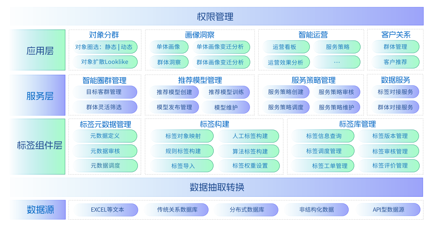 支持多種標(biāo)簽的一站式構(gòu)建方式,人機(jī)協(xié)同完成客戶360°標(biāo)簽體系;并對(duì)外提供多種方式的標(biāo)簽、畫(huà)像、用戶&業(yè)務(wù)數(shù)據(jù)的數(shù)據(jù)共享服務(wù)。