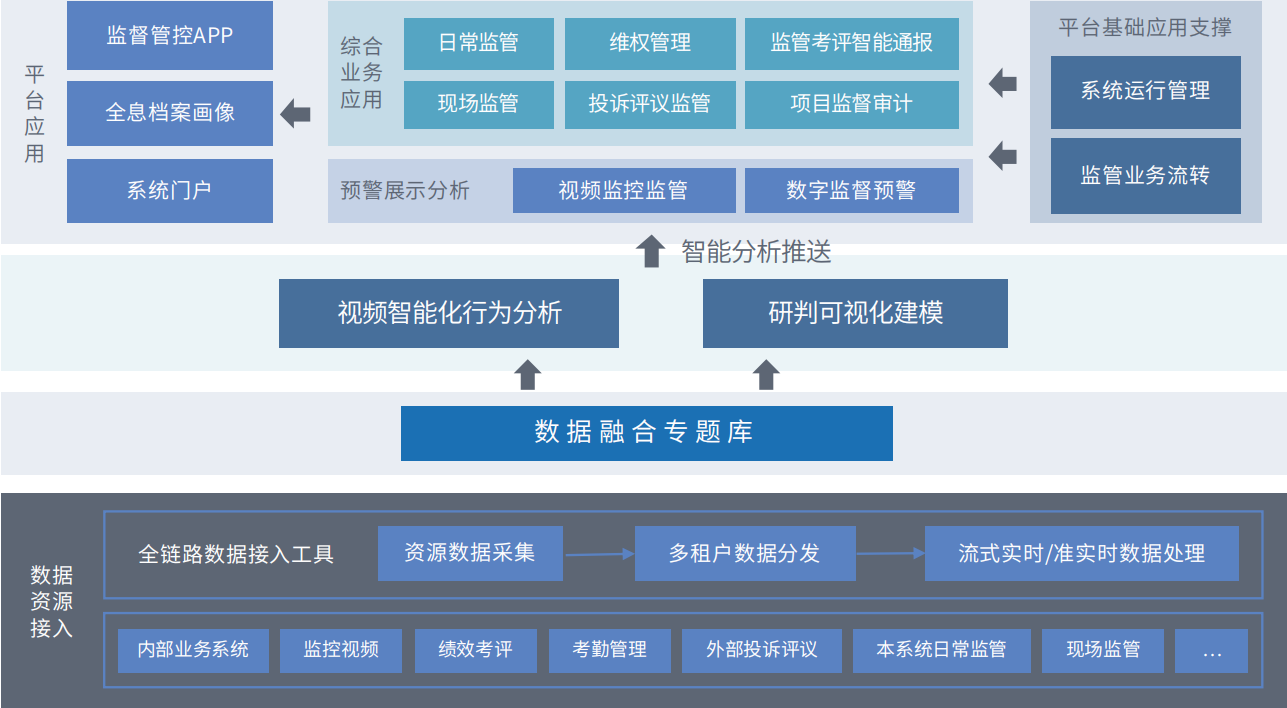大監(jiān)督一體化管控平臺把“執(zhí)法監(jiān)督、依法行政、內(nèi)部監(jiān)督”的智能化監(jiān)督作為系統(tǒng)建設(shè)的主線,實現(xiàn)檢測預(yù)防、提醒自糾、 分析研判、線索倒查和責(zé)任追究,從而全面提升監(jiān)督效能。